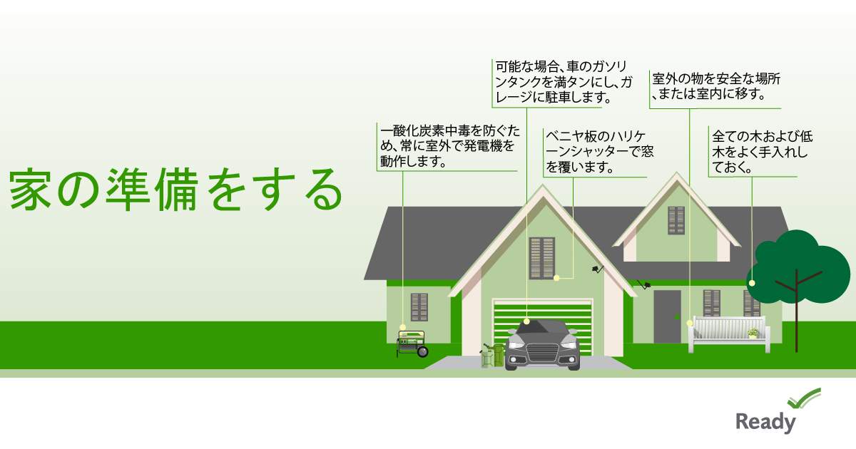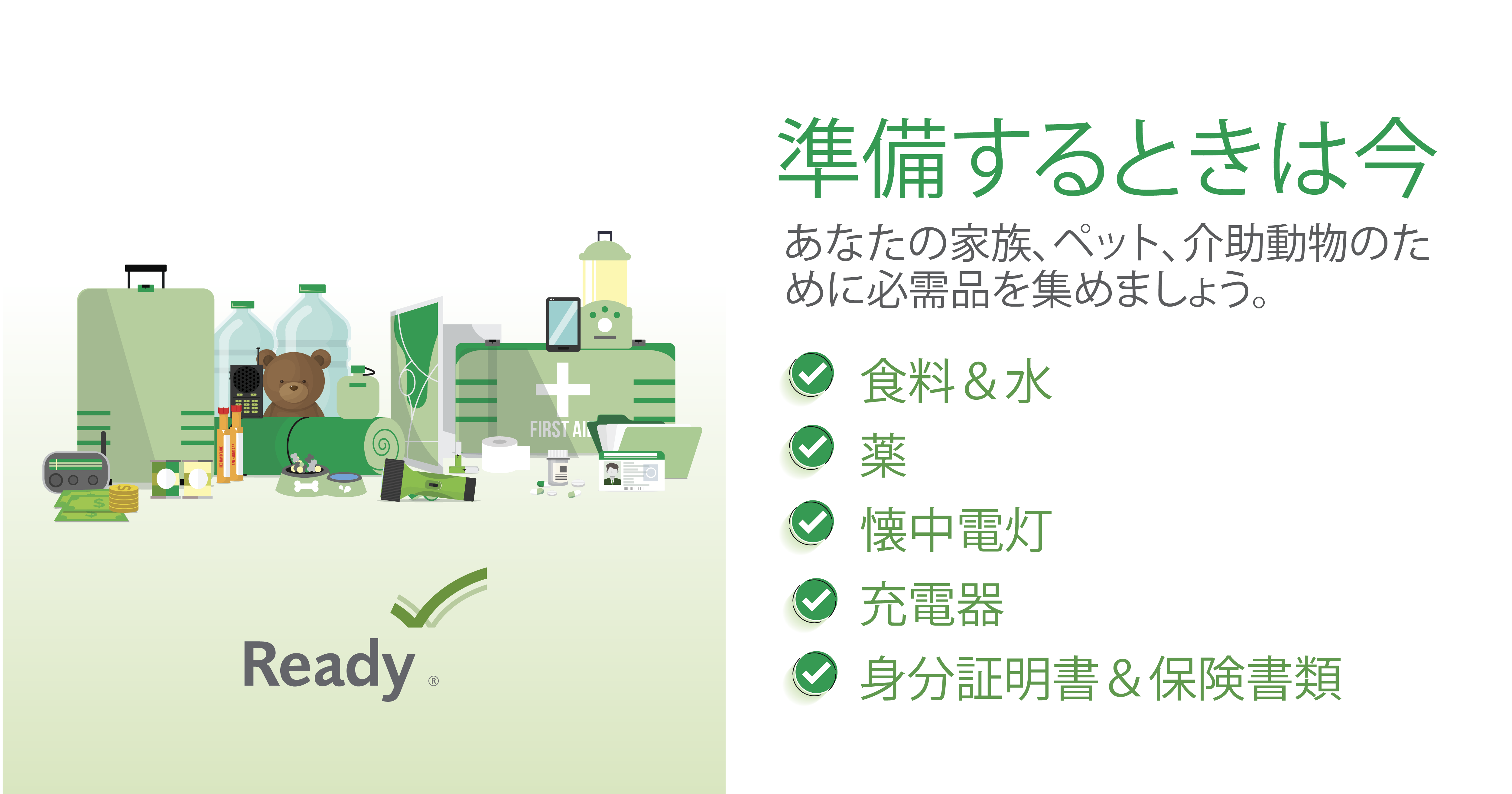 今こそ備えを致しましょう。 家族、ペット、介助動物のための必需品も併せて準備ましょう。 備品には以下が含まれます- 食料と水、お薬、懐中電灯、充電器、身分証明書、保険証。